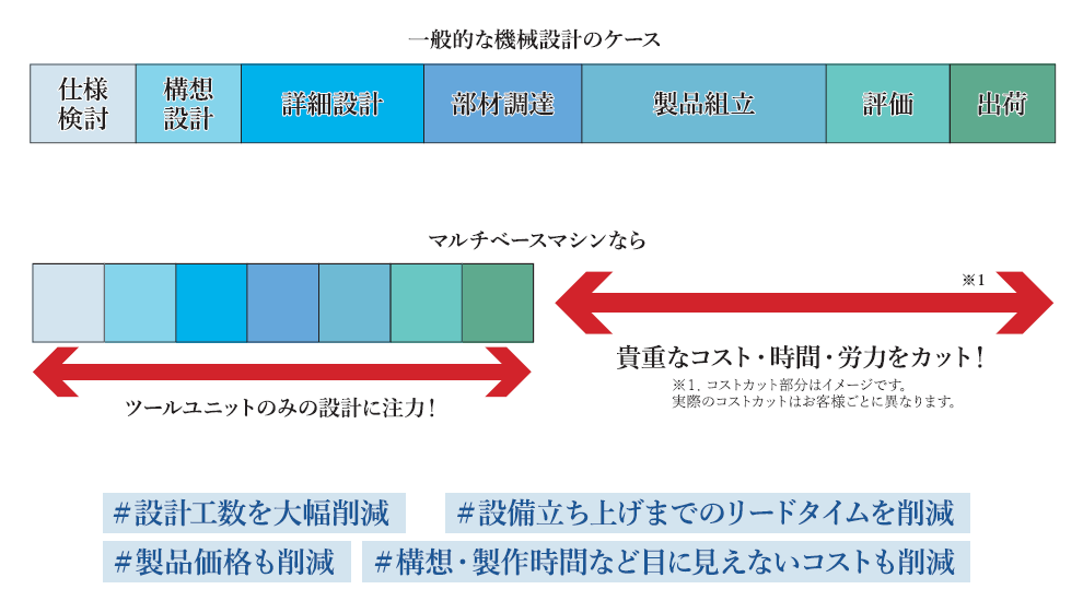 マルチベースマシンはロボットに必要な機能を搭載しており、お客様はツールユニットの設計をいただくだけで、設備立ち上げまでのリードタイムとコストを大幅に削減できます。