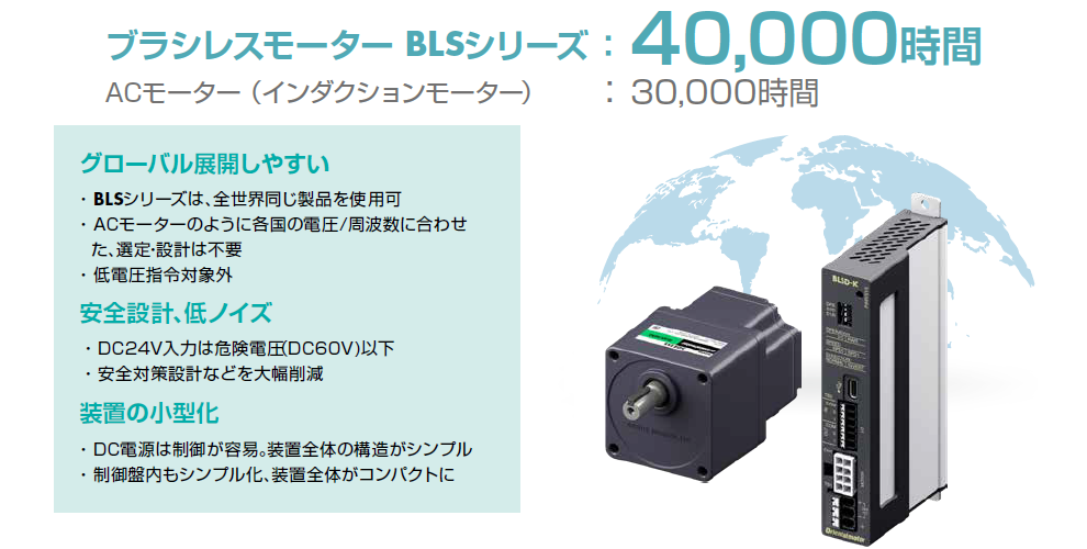 BLSシリーズは、全世界同じ製品を使用可能。ACモーターのように各国の電圧/周波数に合わせ