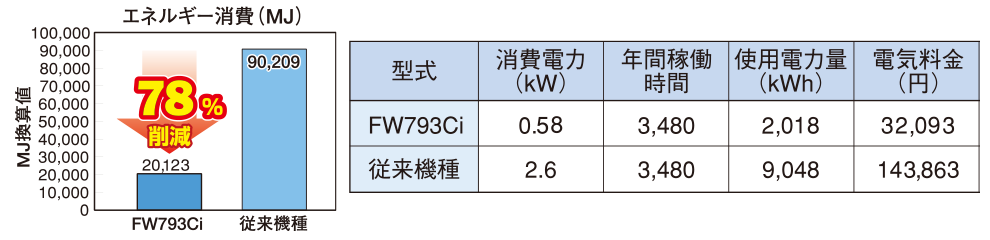 左の図は、FW7の3相タイプFW793Ciと従来機種の比較です。