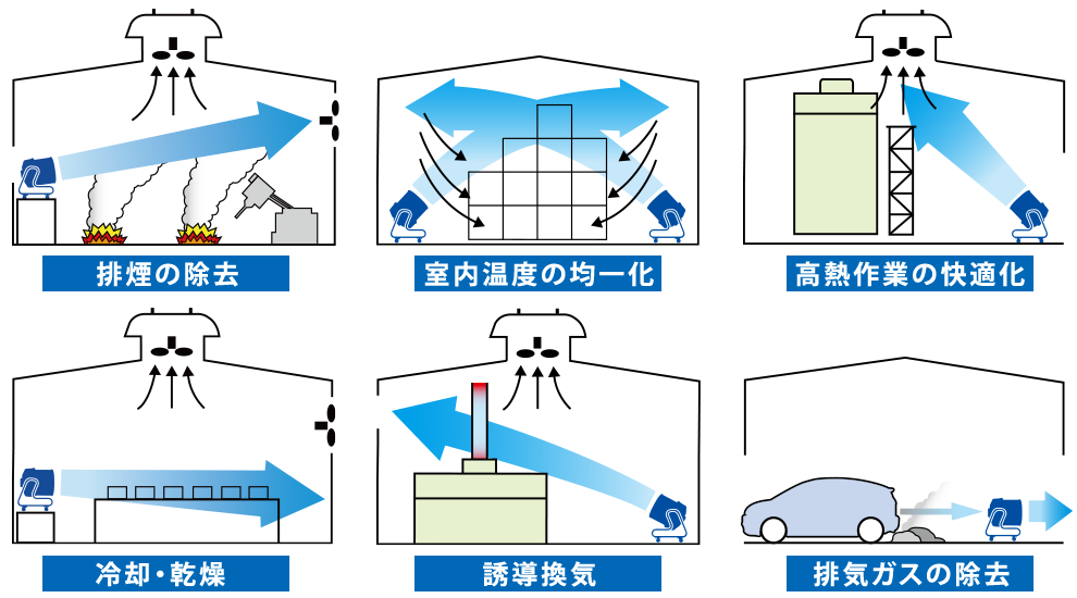 風の直進性を活かして、ワークの冷却や屋内から屋外への排気ガスの除去などを効果的にこなします。